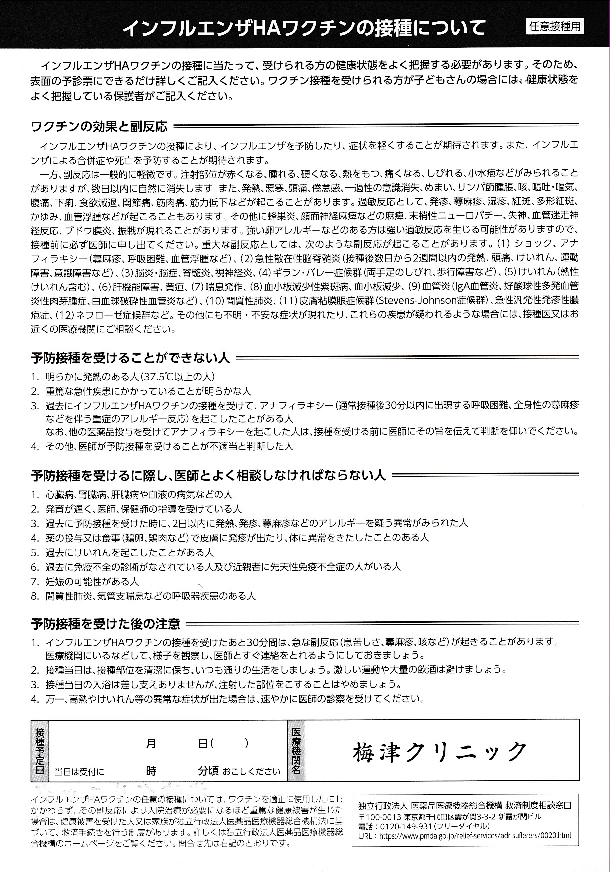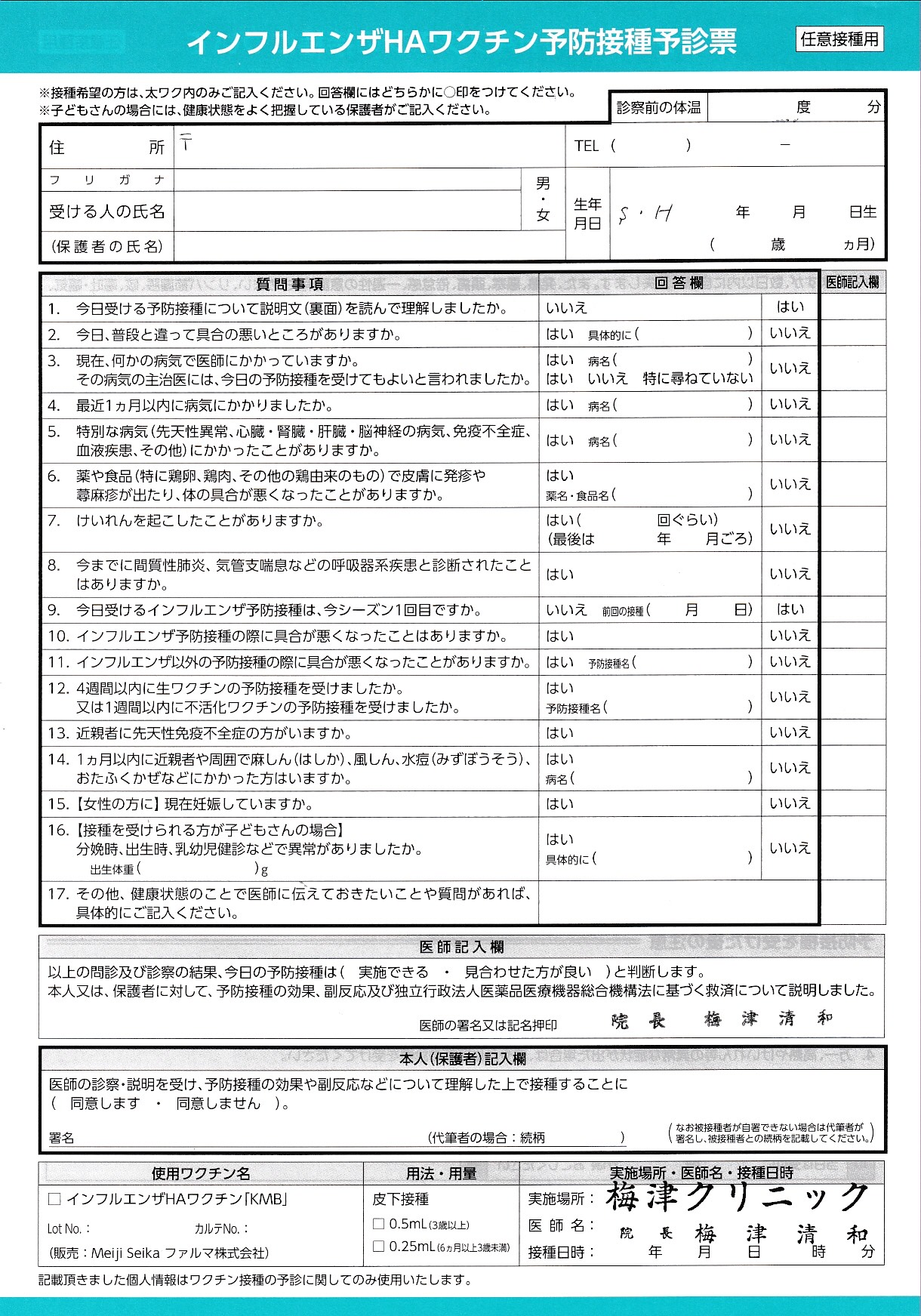 当日は、予診票をダウンロードし、体温と必要事項記入の上診察券と一緒にお持ちください。予診票は当院の廊下にもご用意しております。18歳以下は、保護者の方の署名が必要となります。